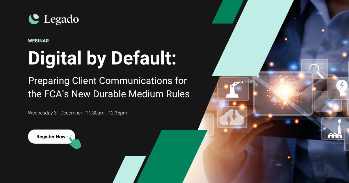 From 12 January 2026, the FCA’s PS25/13 makes digital the default durable medium for client disclosures - a major shift in how firms communicate with clients. Join Legado’s free 45-minute webinar to understand what’s changing, what to prepare, and how to meet the new standards for secure, auditable, and durable digital delivery. The session will share practical guidance and a live demonstration of Legado’s CommsHub and Digital Vault, showing how firms can deliver, store, and evidence communications confidently and at scale.